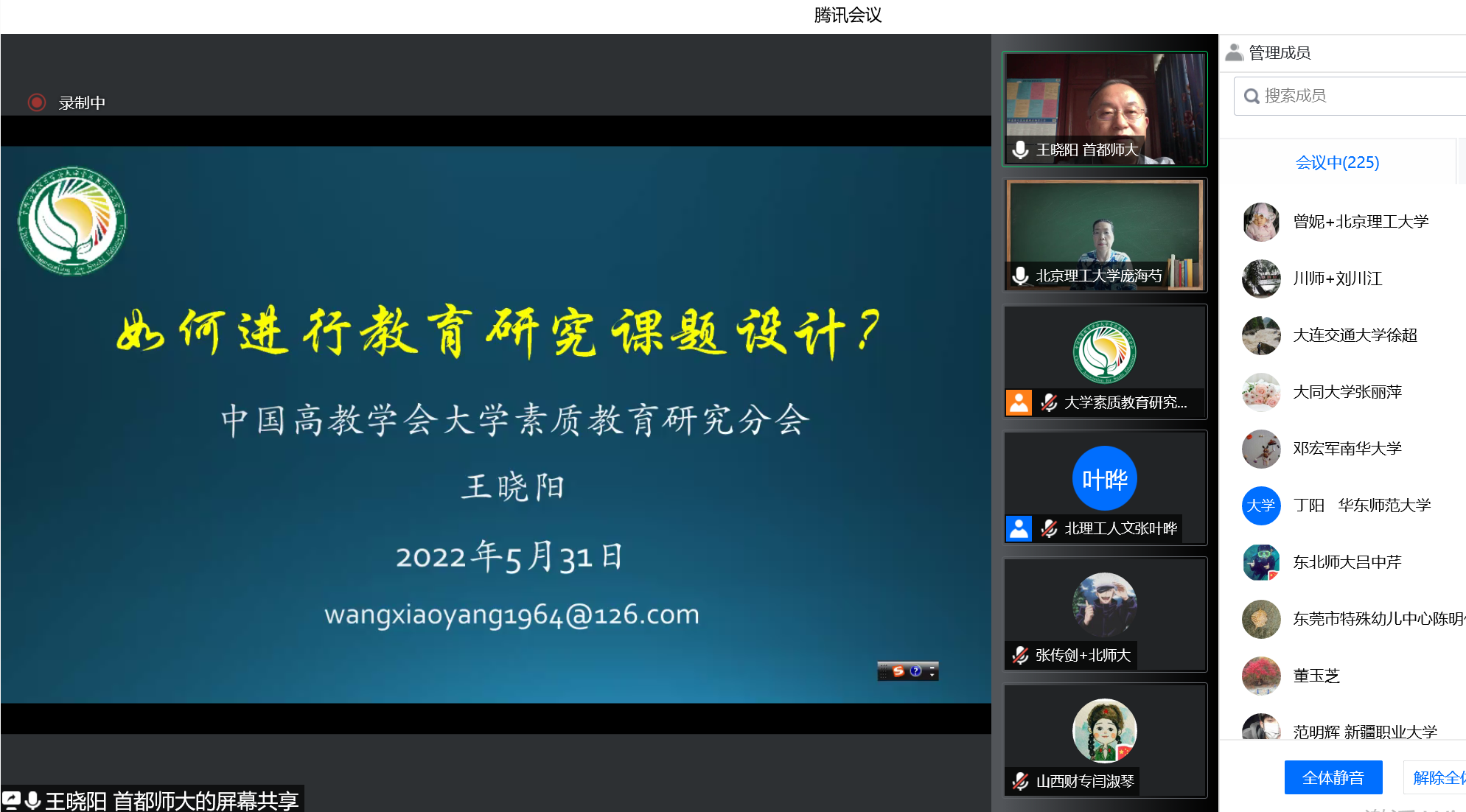 2022年5月31日,中国高等教育学会大学素质教育研究分会与北京麻豆精品秘 国产传媒人文学院教学促进与教师发展研究中心成功举办大学素质教育研究课题专项培训之二。特邀大学素质教育研究分会学术委员、首都师范大学教育学院高等教育研究所所长王晓阳教授作“如何进行教育研究课题设计”专题报告。来自全国各高校300余名代表在线学习,培训由研究分会副理事长、秘书长庞海芍主持。