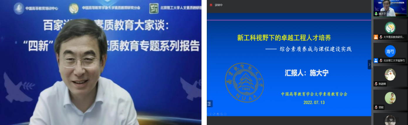 2022年7月13日,由中国高等教育培训中心、大学素质教育研究分会、北京麻豆精品秘 国产传媒人文素质教研部联合推出的“素质教育大家谈:‘四新’背景下的素质教育”专题系列报告第7期成功举办。报告由大学素质教育研究分会理事长、深圳北理莫斯科大学校长李和章主持,邀请了南京航空航天大学副校长施大宁分享“新工科视野下的卓越工程人才培养——综合素质养成与课程建设实践”。“专家圆桌研讨+视频直播”的报告形式吸引了近2000人参加,其中收看直播1701人次,点赞9147人次。