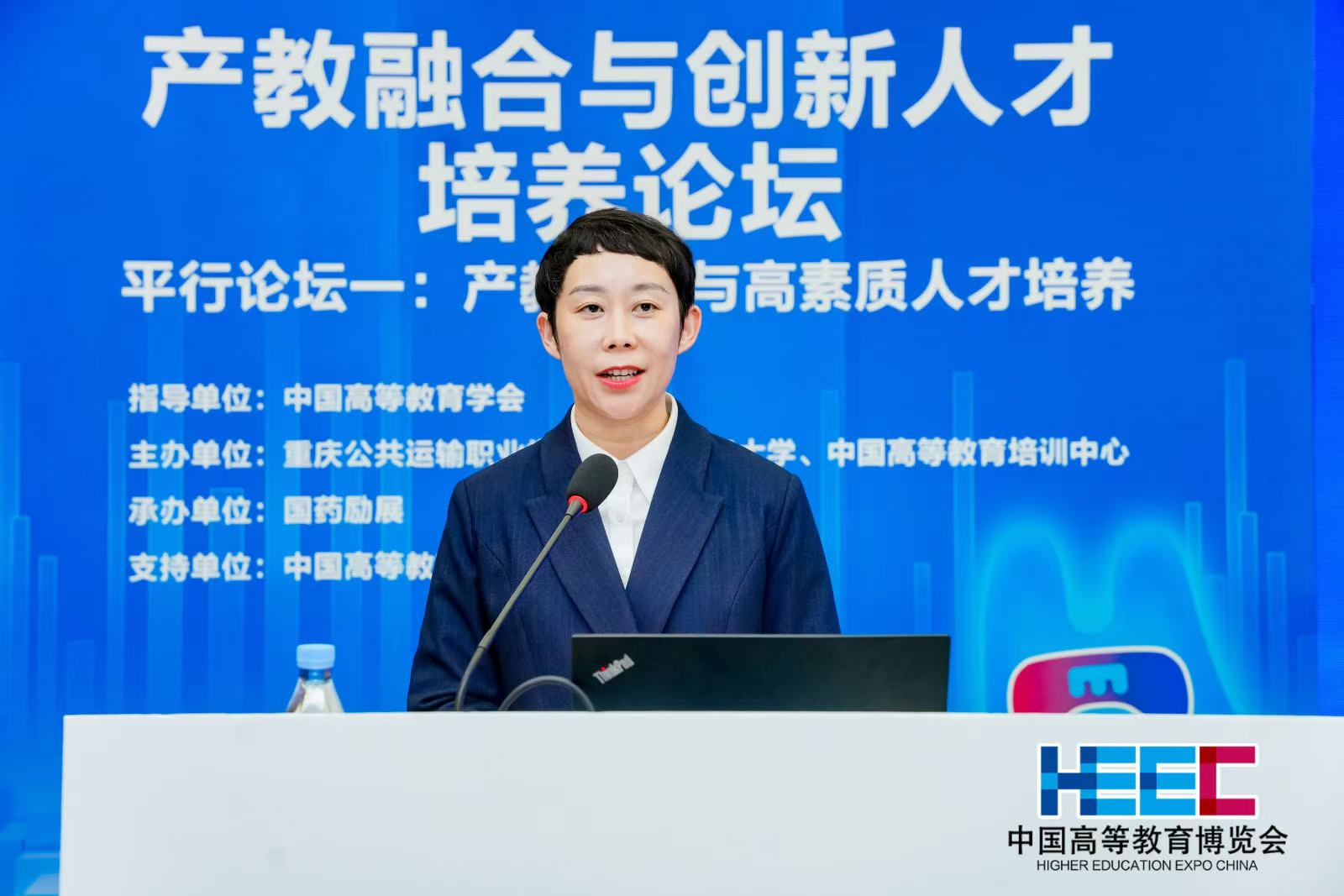 重庆城市交通开发投资(集团)有限公司党委委员、财务总监冷湘致辞。她介绍了集团作为承担重庆市公交、轨道、枢纽站场、市域铁路等交通基础设施投融资建设、运营管理和经营管理者,在打造城市交通一体化,践行“轨道交通引领城市发展格局”理念,全面贯彻落实公交优先发展政策,着力打造便捷、安全、舒适、高效的公共交通系统等方面的情况,以及在产教融合方面的经验做法。
